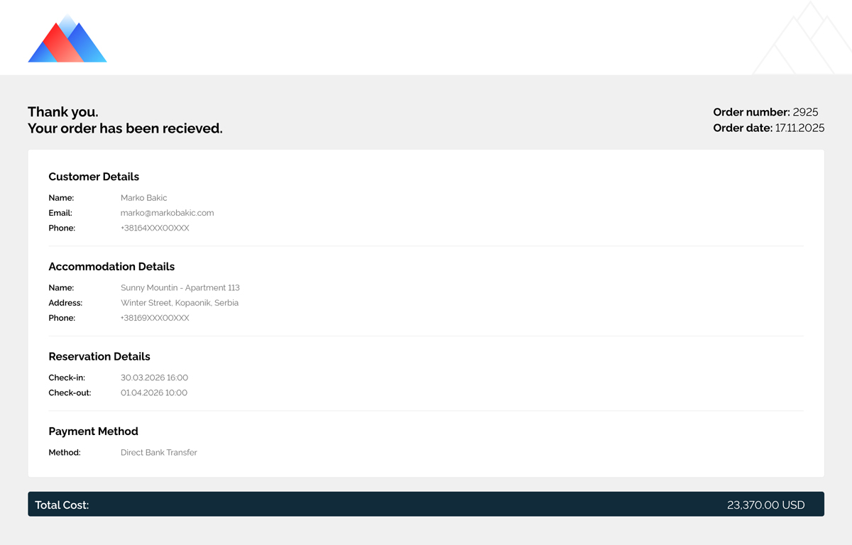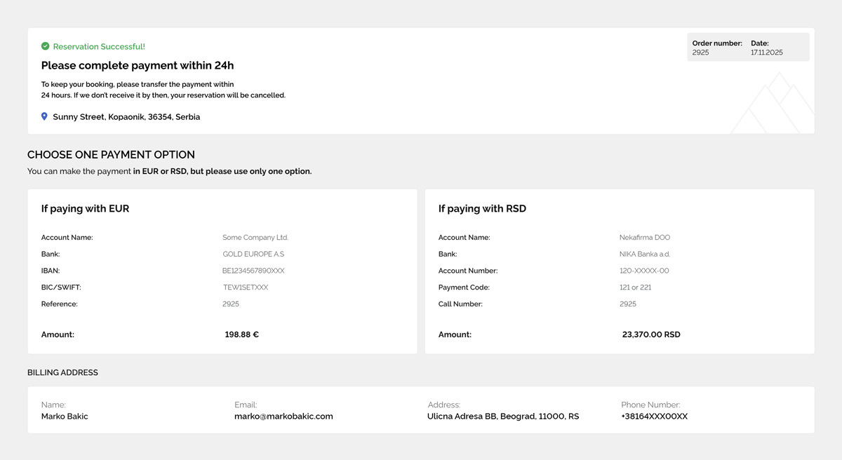 - Direct Bank Transfer (BACS) → two-page PDF including bank instructions and reservation summary