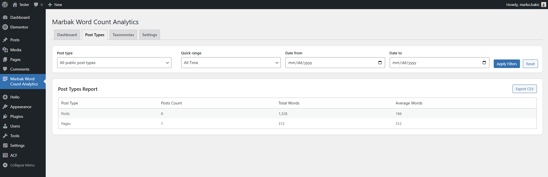 The plugin adds a small admin area with an overview screen, a post types report, a taxonomies report, and a settings screen. Reports are generated after clicking Apply Filters, which keeps the first load lighter on larger sites. You can filter by post type and date range, then export the current results as CSV if needed. Screenshots on the WordPress.org page show the published interface clearly: overview, post types table, taxonomies table, and settings.